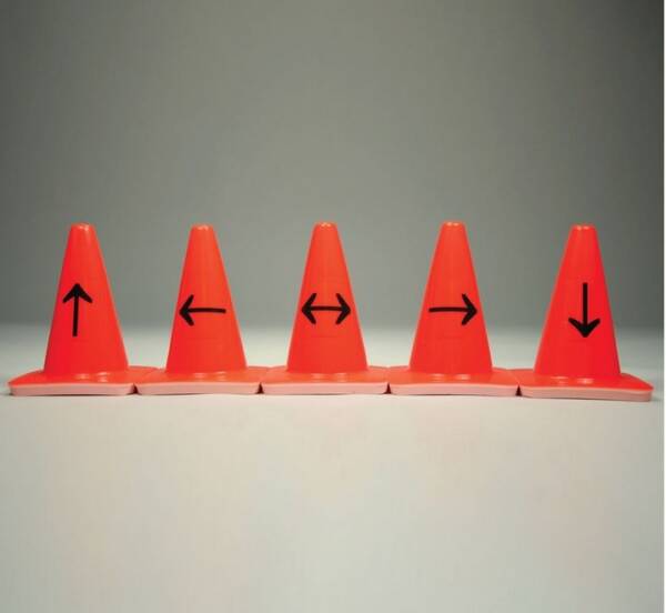 La base lestée maintient fermement le cône en place. Chaque cône est marqué sur deux côtés. Ces cônes numérotés sont disponibles en quatre jeux différents jusqu’au numéro 100, ou encore de A à Z.